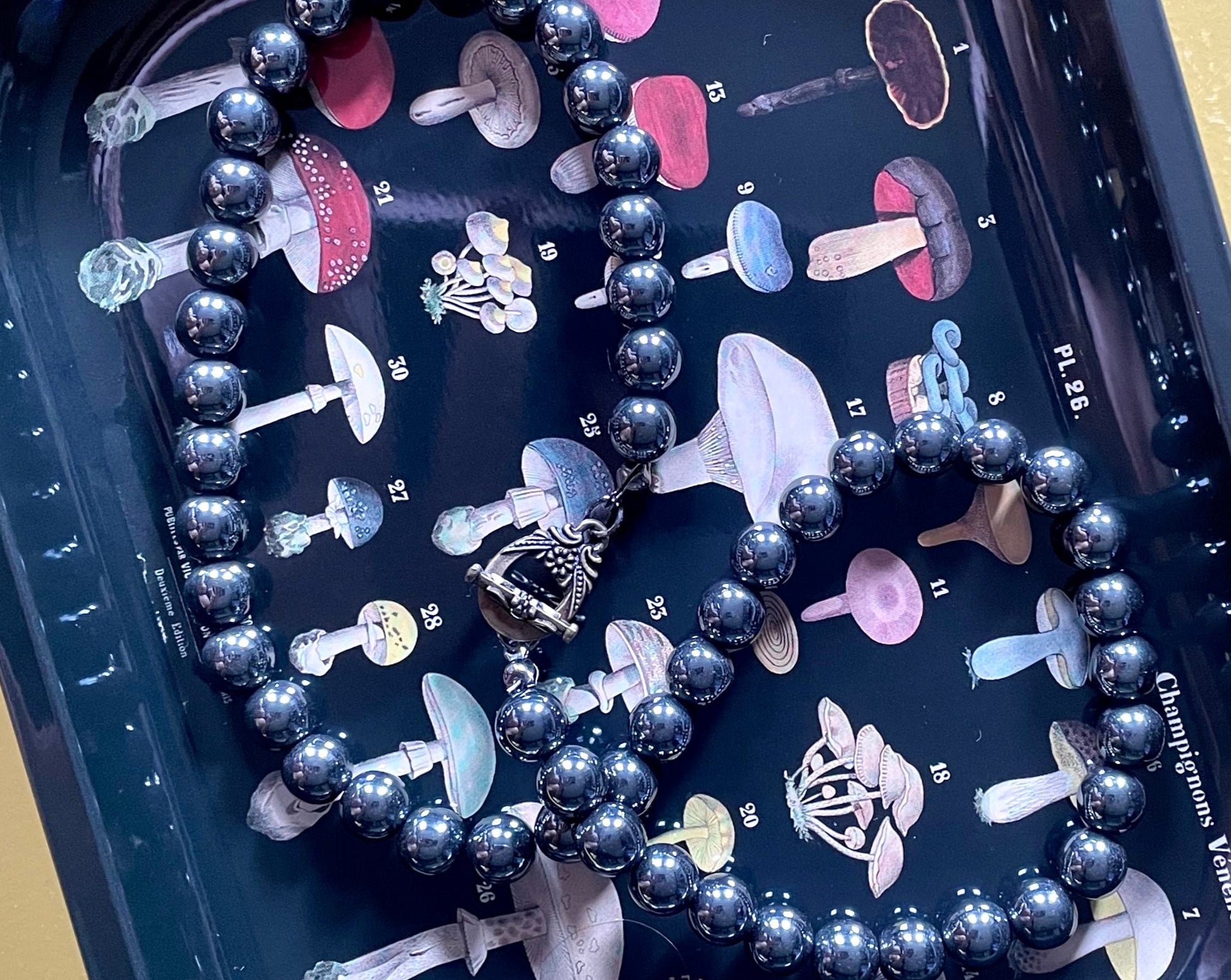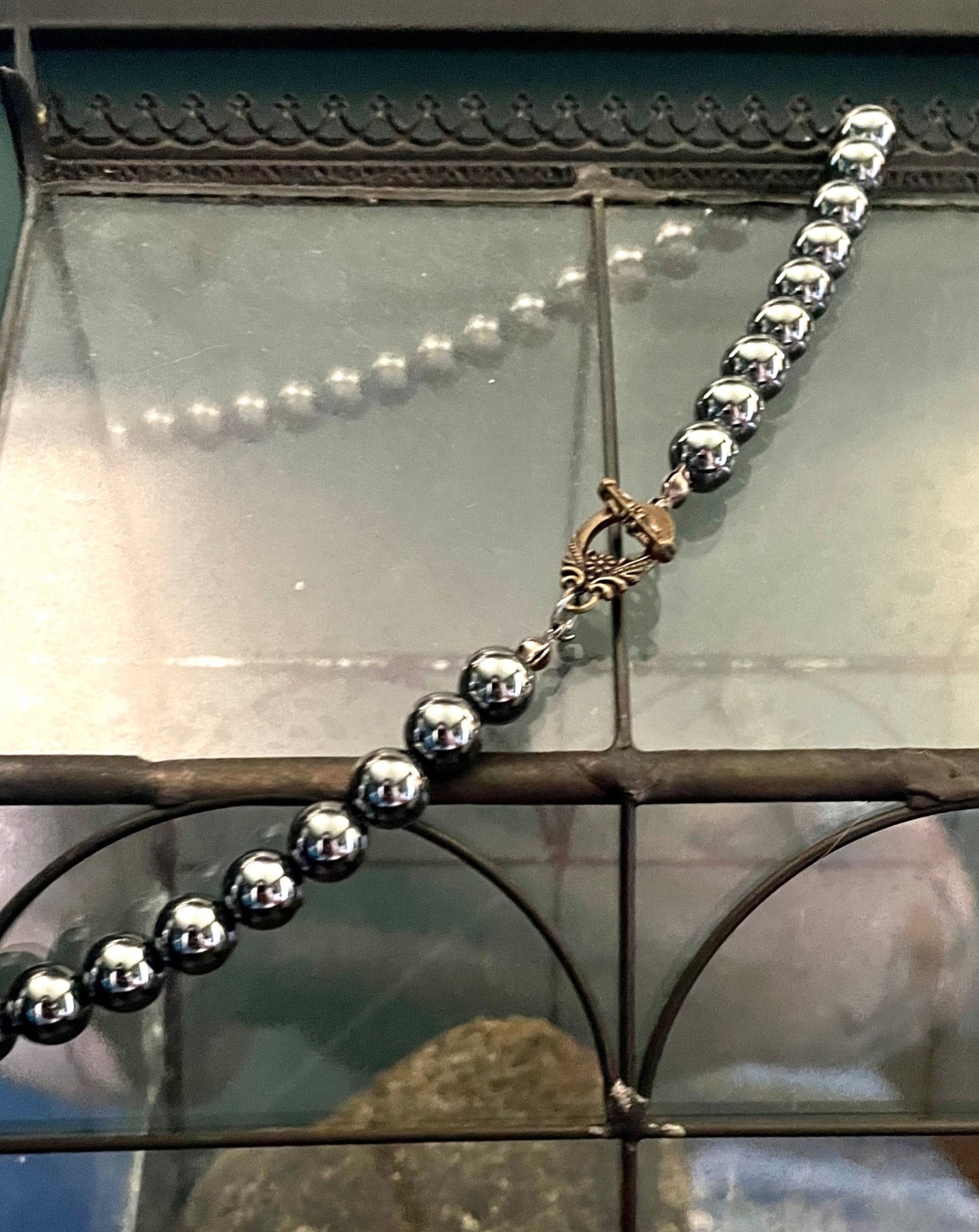 8mm Hematite beads with a decorative toggle clasp, 16"