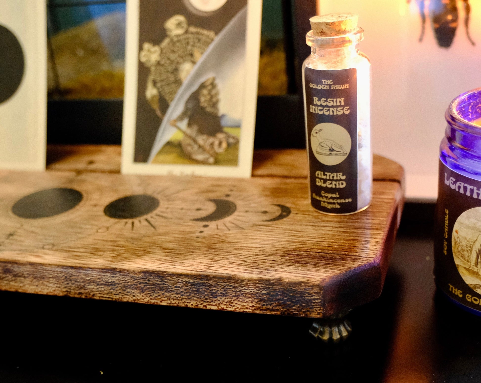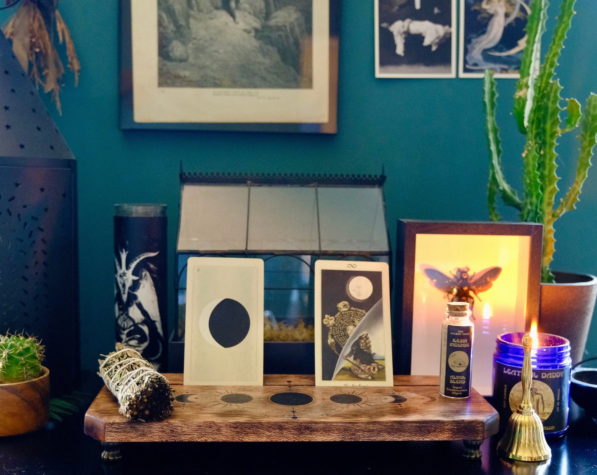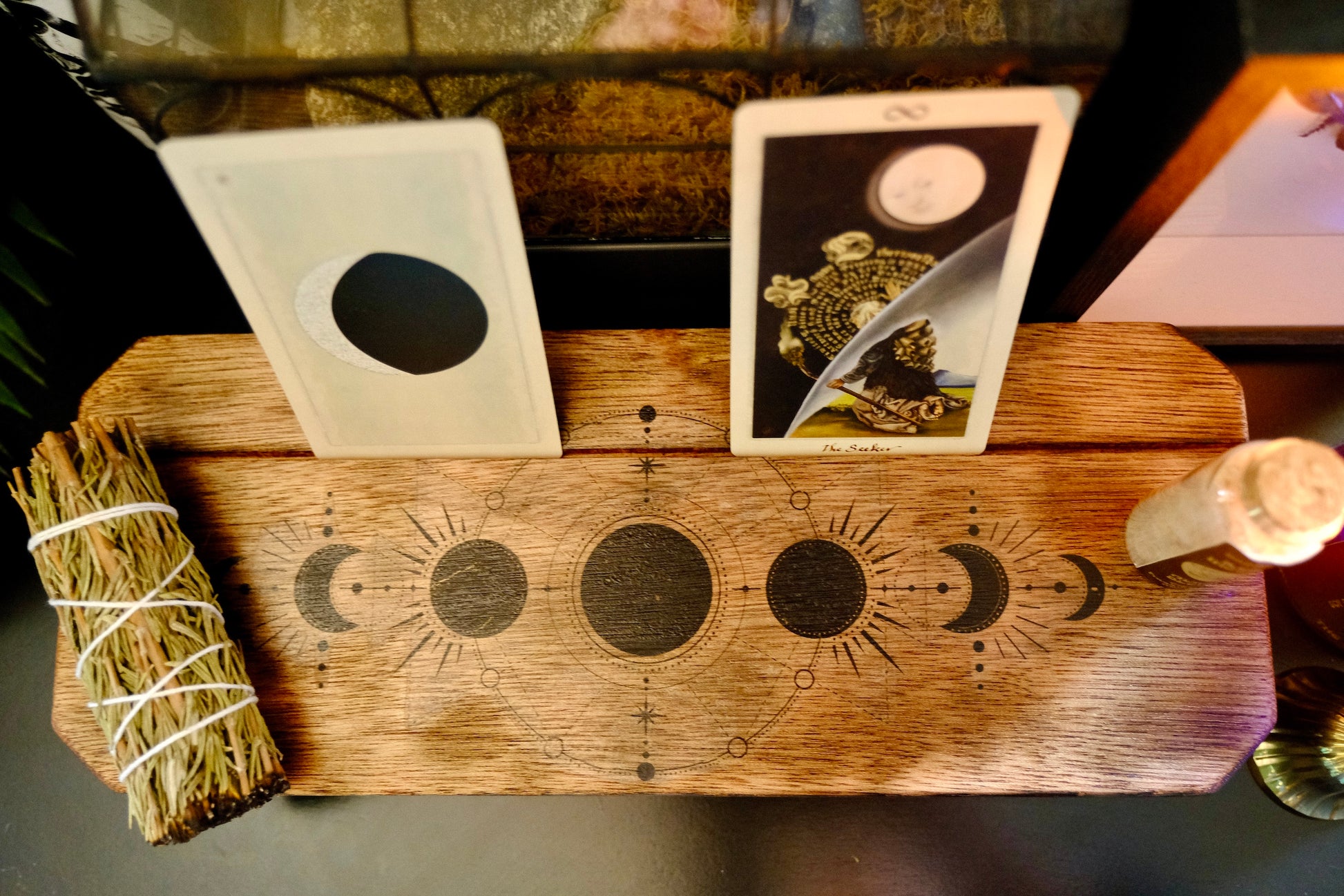 A beautiful handmade Altar Tarot Stand with Moon Phase Graphic.