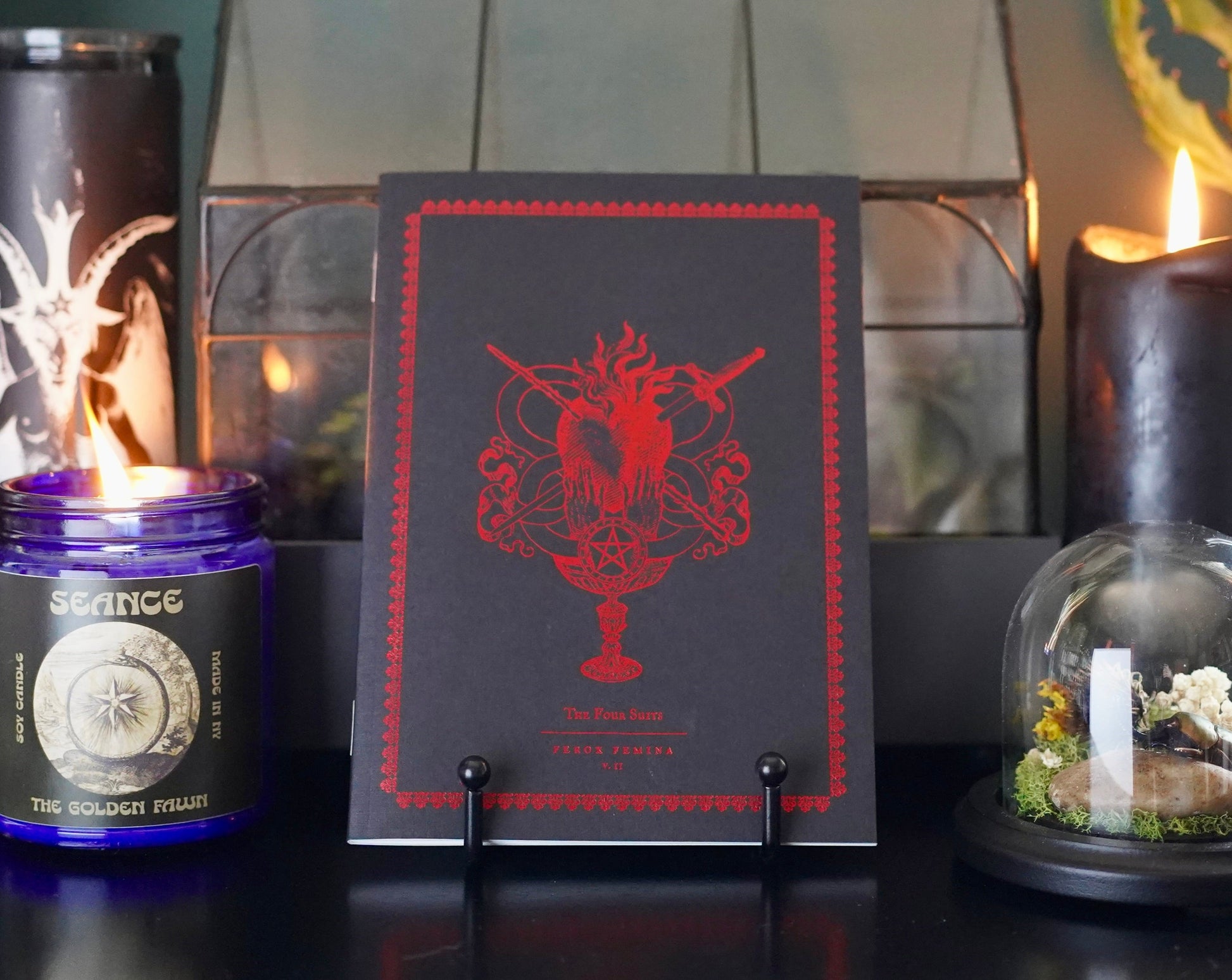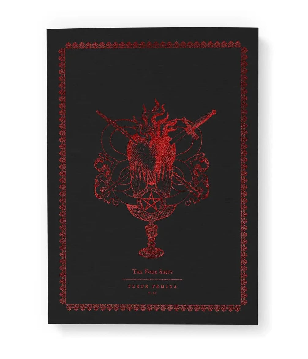 A stunning little lined notebook with a red foil image depicting the tarot suits and a blazing heart. Perfect purse-size, to use for documenting tarot draws, or a personal grimoire.