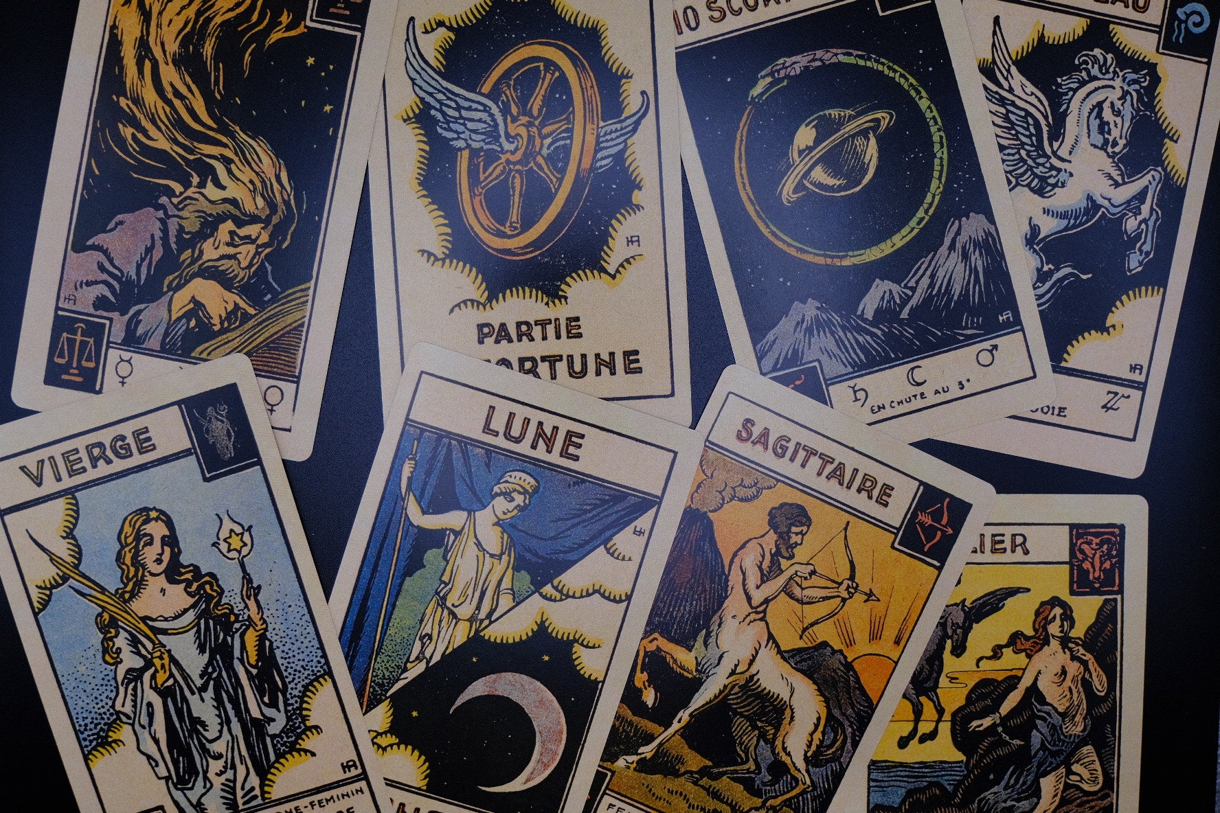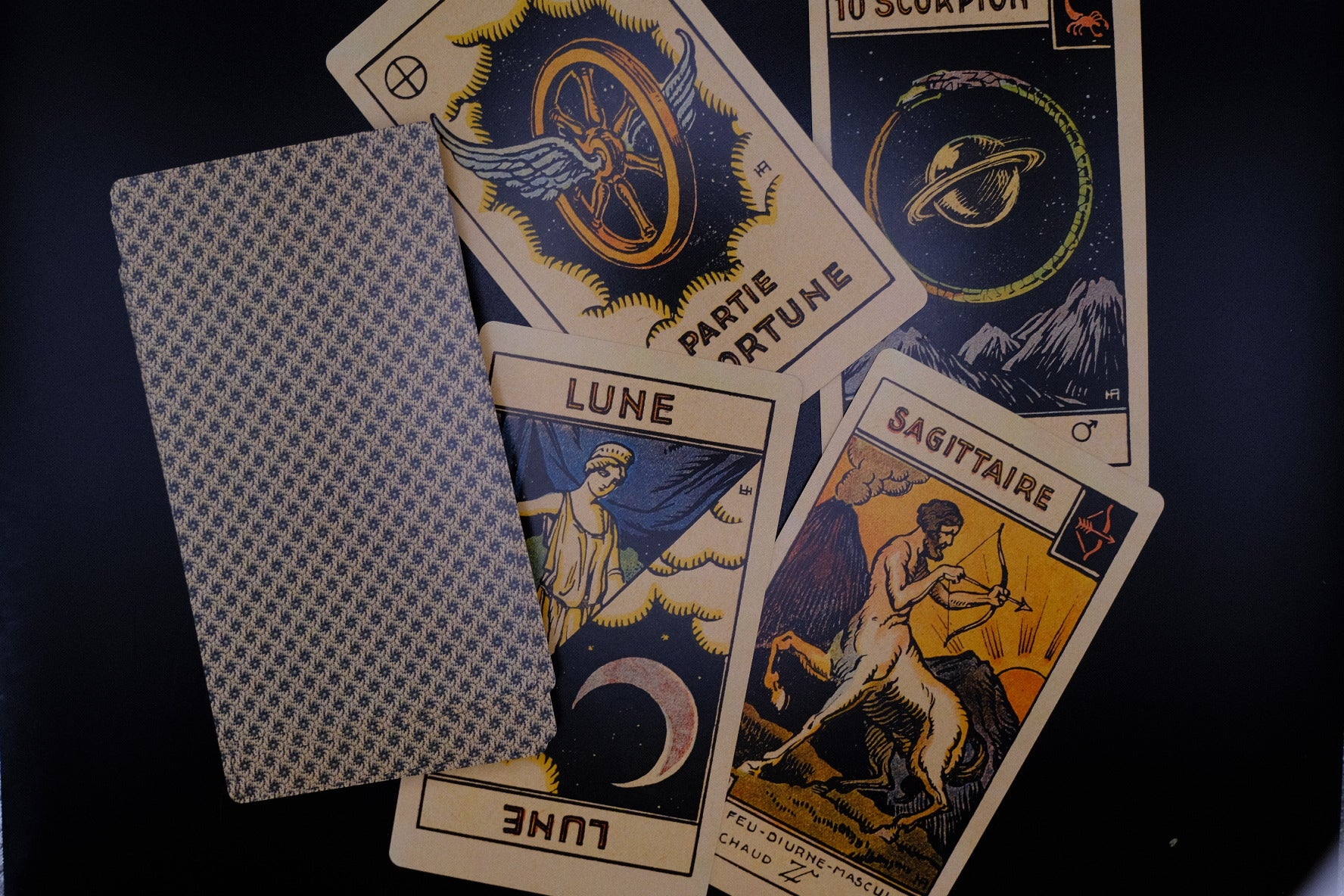 Le Tarot Astrologique was published in 1927 in Paris by B. P. Grimaud. The cards were created by George Muchery, an important French occultist (1892-1981), and designed by Henri Armengol, a French artist (1880-1939). At its base an astrological oracle deck, Le Tarot Astrologique seeks to combine the elements of astromancy with tarot. The deck consists of 48 cards: 36 zodiacal sign cards, 9 star and planet cards, and one of each of the ascendants, the ascending node/the descending node, and part of fortune. The zodiac is split into three cards for each sign, 0, 10, and 20. Most cards have double ended card titles, astrological names, descriptions, and symbols of planets. A visually beautiful deck, the design of the cards displays the telltale strong lines and coloring showing the dramatic signs of cards produced shortly after the Great War.