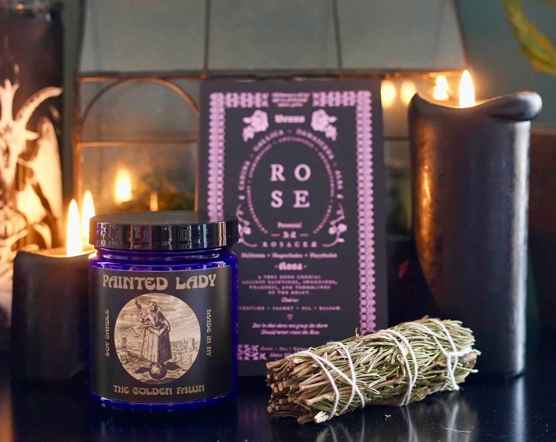 A Painted Lady Spell Candle by Golden Fawn - Golden Rose and Oak Moss scented, infused with herbs and fixed with a self-love/attraction spell by our House Witch.