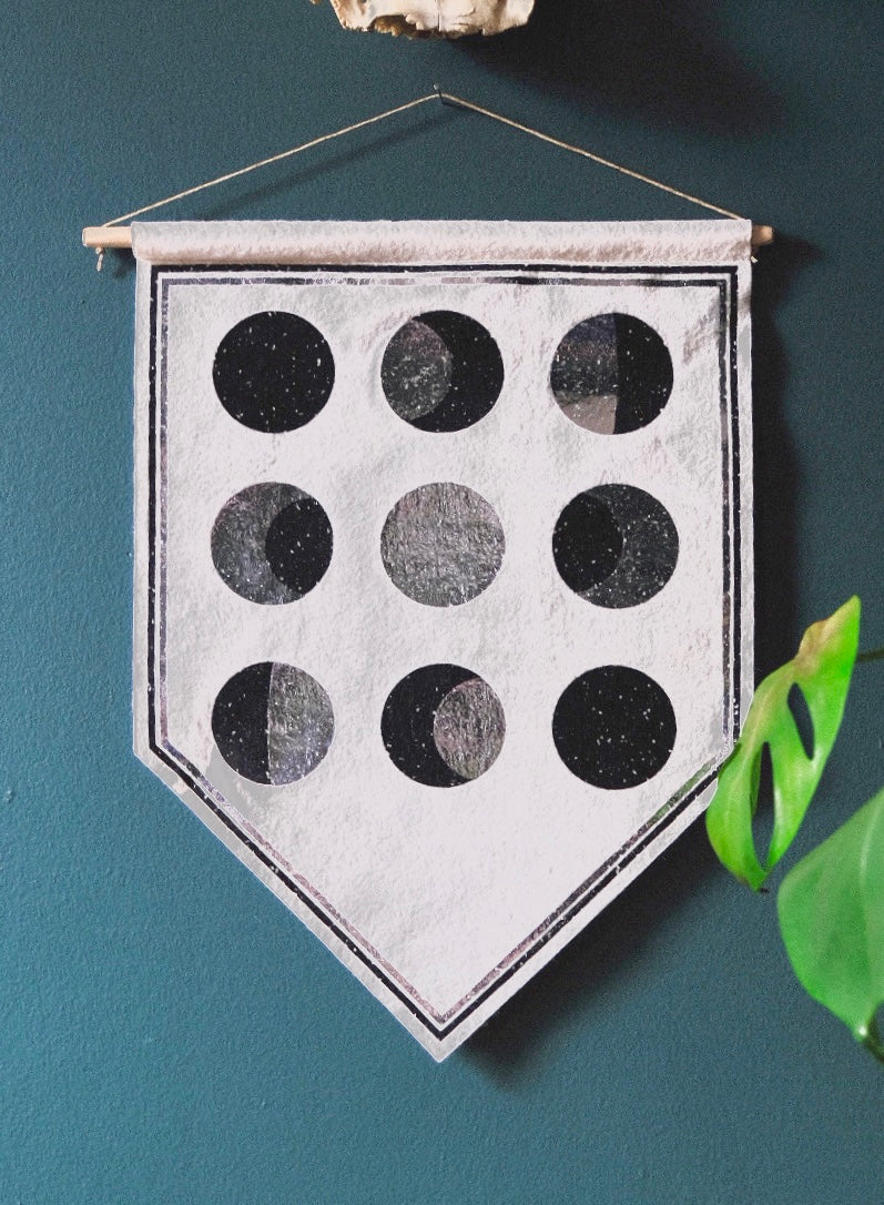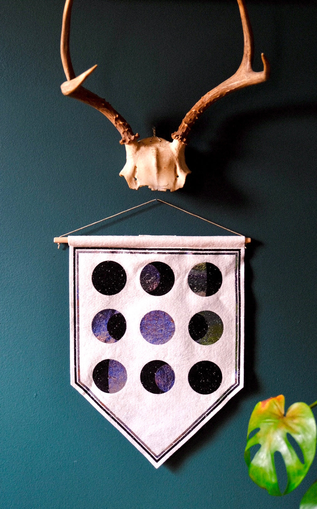 Metallic and pigment print on wool felt blend with wood dowel and hemp twine.