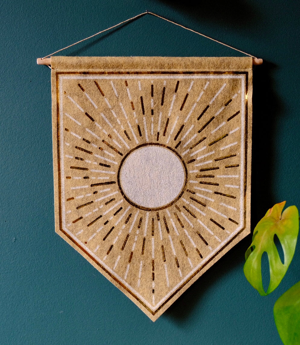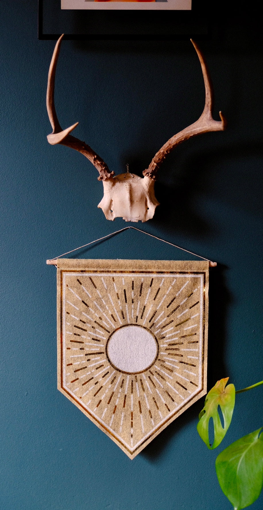 Metallic and pigment print on wool felt blend with wood dowel and hemp twine.