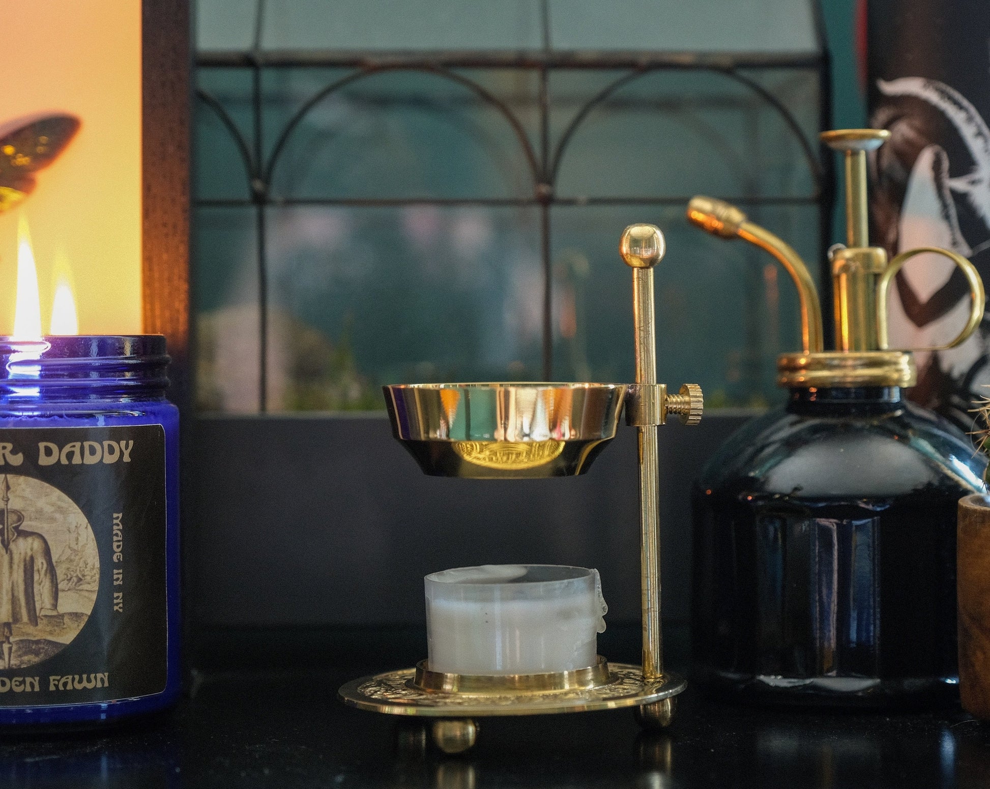 A brass incense burner for resin incense that does not require a charcoal disk. Just place a tealight candle beneath the screen and adjust the height for your burning speed preference. Can also be used for loose herbal incense or as a stand for cone incense. A beautiful addition to any altar.