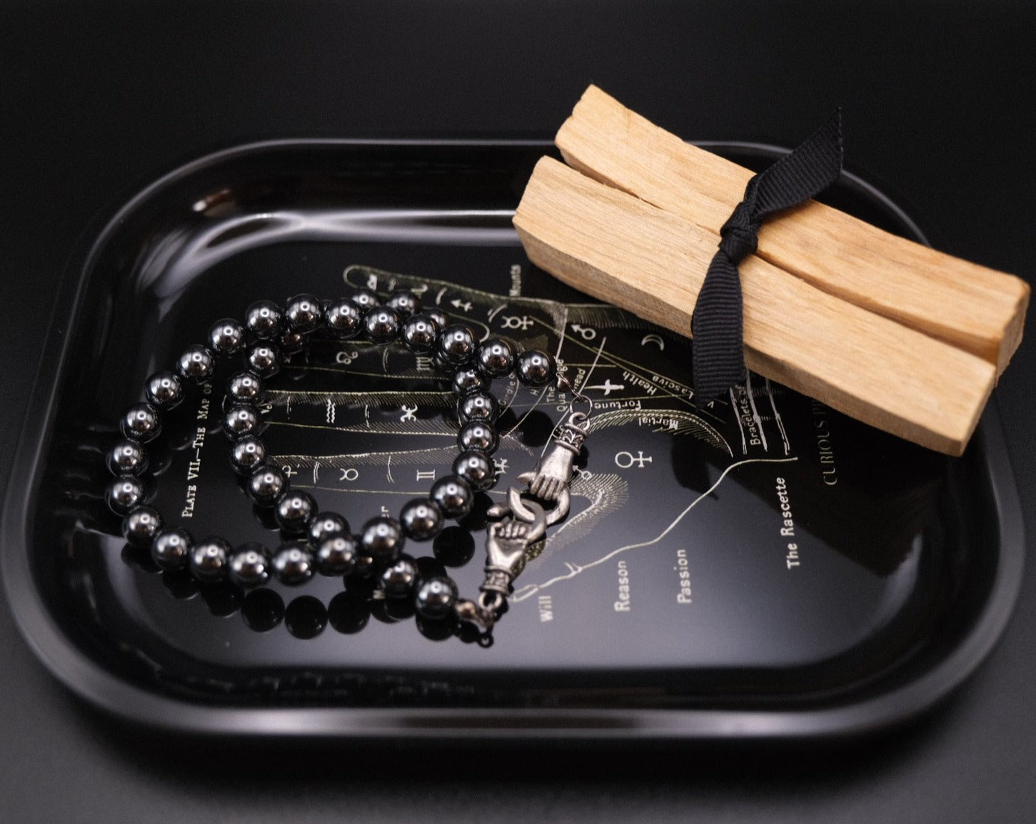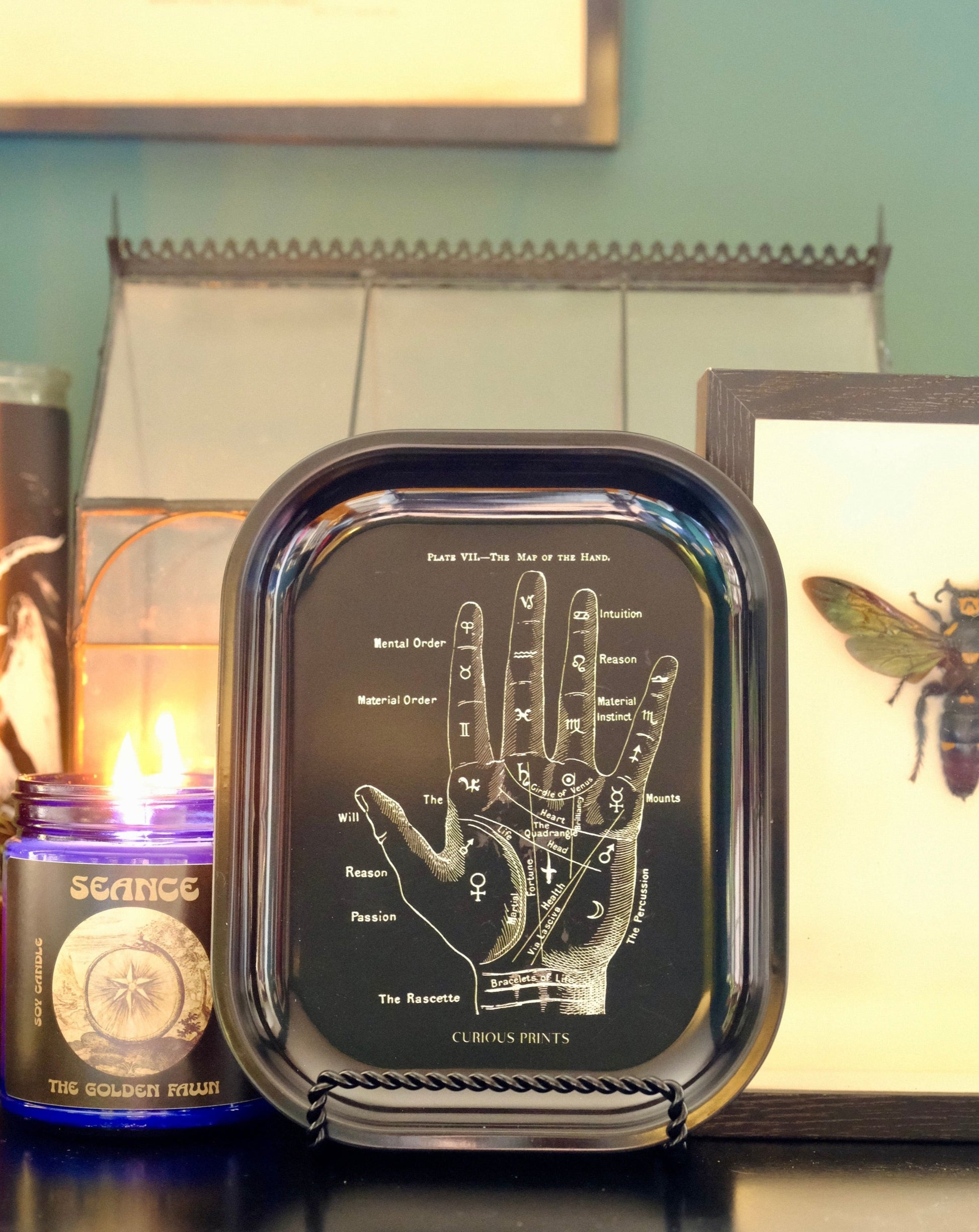 A vintage inspired tray for any of your rituals. 5"x7" tray made of sturdy metal (will not bend). Features vintage illustrations a palm reader's chart. Perfect as a catch-all tray, rolling tray, or use in your ritual space.
