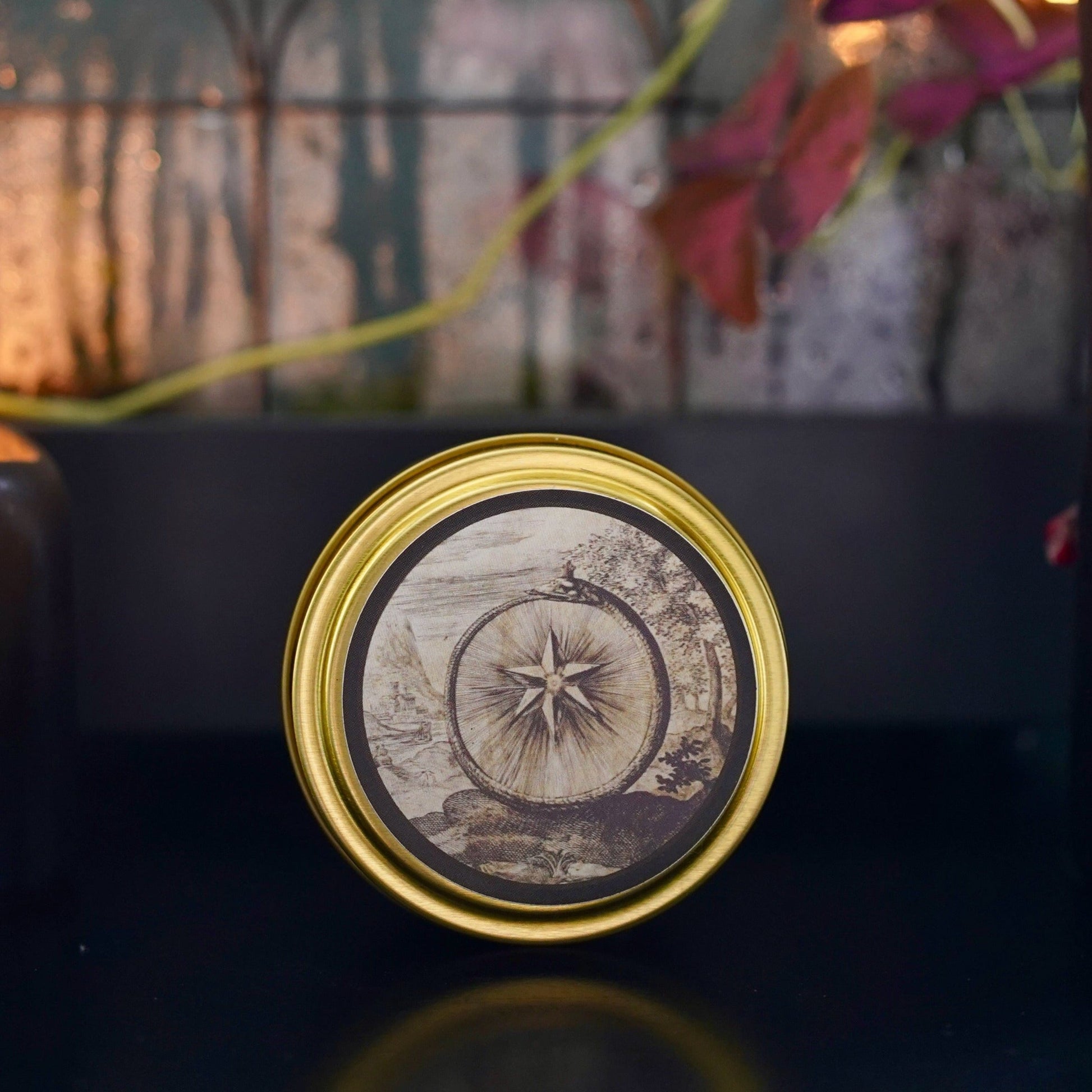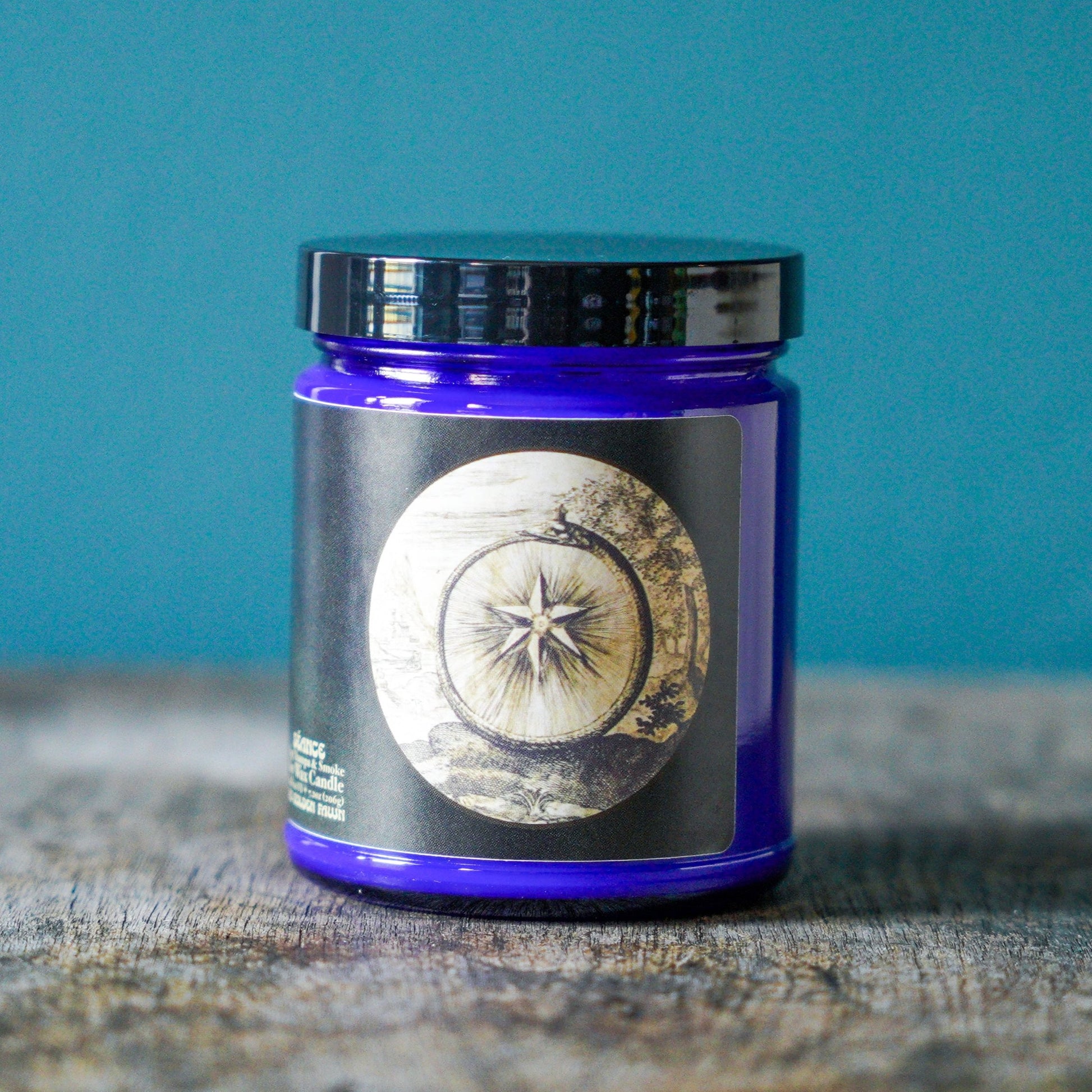 Available as 9 oz soy candle in a beautiful blue jar, or 6oz gold tin made from recycled materials.